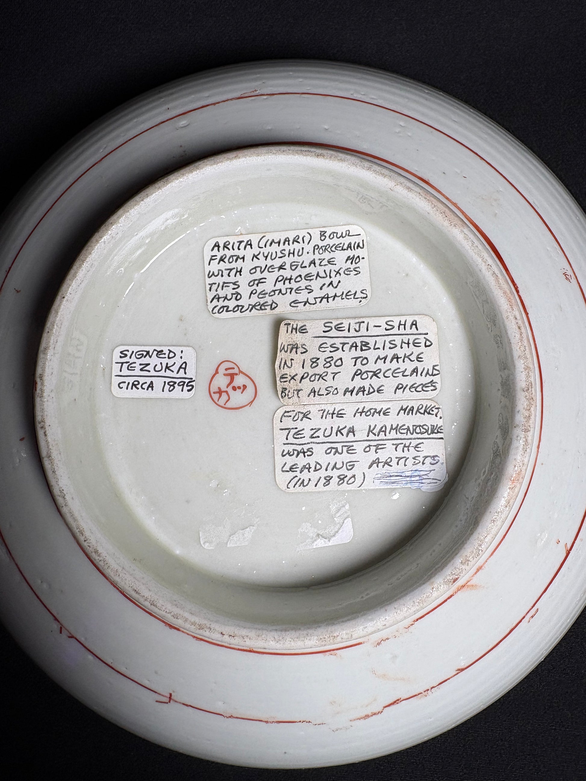 The piece is signed “Tezuka”, referring to Tezuka Kamajirō (or Tezuka Kamensuke), one of the leading artists associated with Seiji-sha, a kiln established in 1880 that specialized in fine export porcelains while also producing select works for the Japanese domestic market.