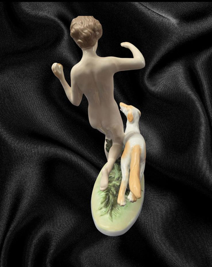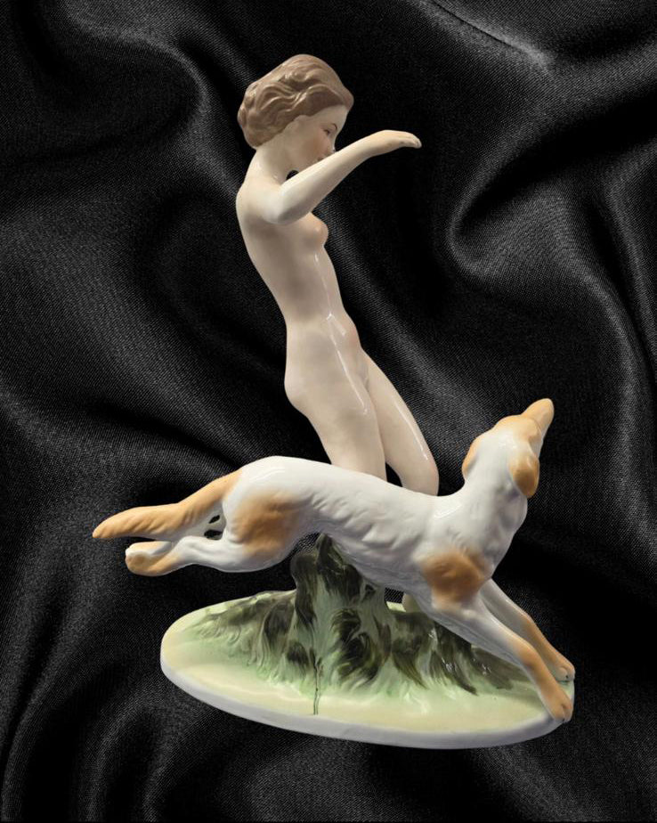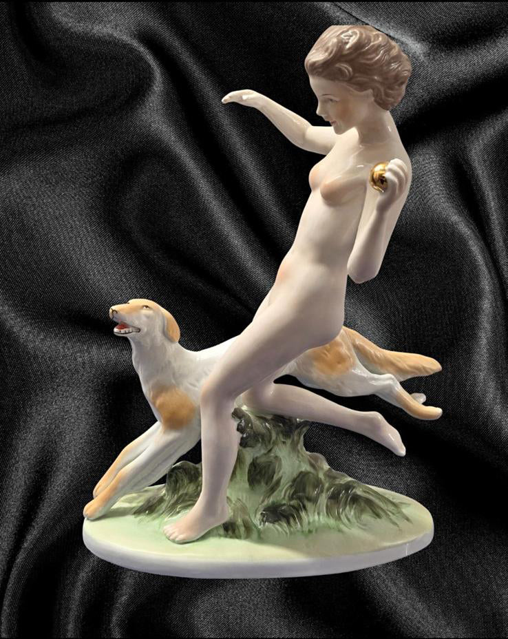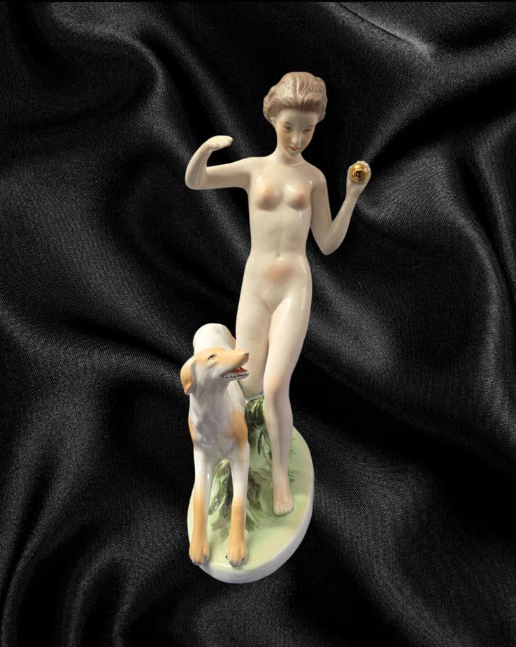 Bring timeless elegance and artistic beauty into your space with this exquisite vintage porcelain figurine, featuring a graceful nude female figure accompanied by a loyal dog. This finely crafted piece captures a sense of movement, joy, and freedom, as the woman playfully runs forward, holding a golden orb, with the dog faithfully at her side.