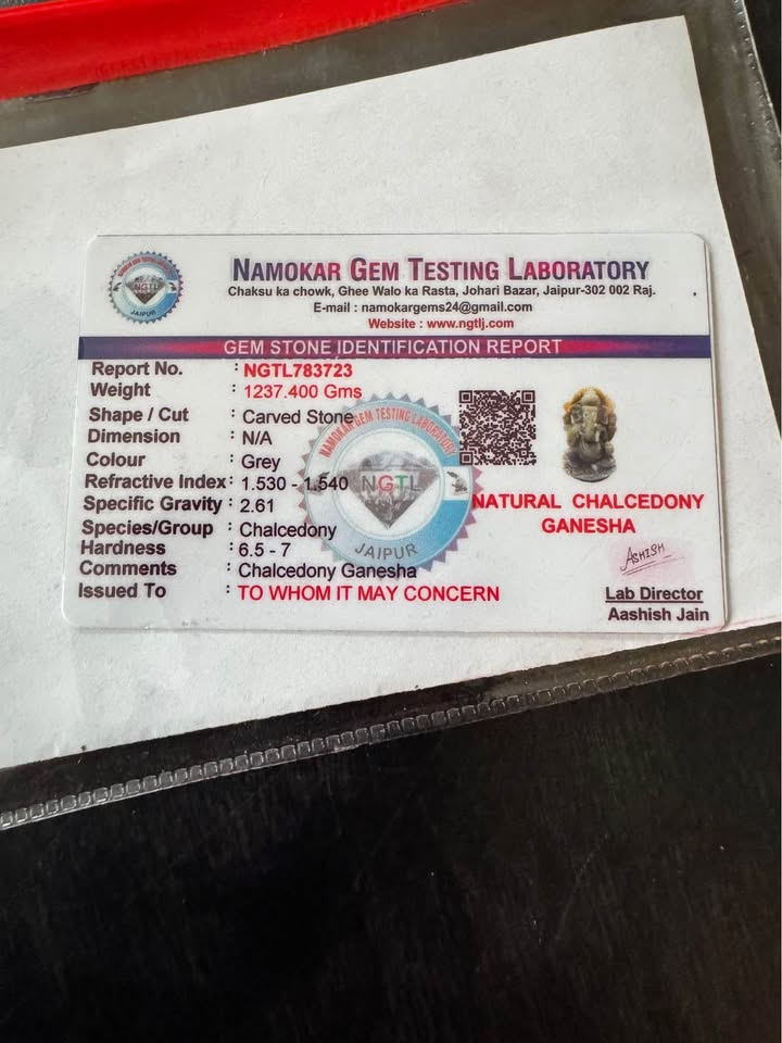 Elevate your spiritual space with this rare and exquisite Ganesha idol, hand-carved from Natural Chalcedony and officially certified by the Namokar Gem Testing Laboratory, Jaipur.